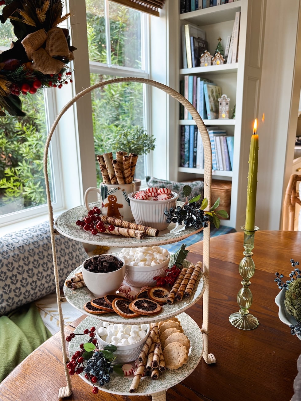 To show the recent chocolate bar toppings, we used this tiered rattan stand with the dinner plates from this attractive dish set. Little bowls for marshmallows and darkish chocolate, treats tucked in right here and there, and for a fairly seasonal contact we embellished the plates with preserved oranges and sprigs of fake berries.