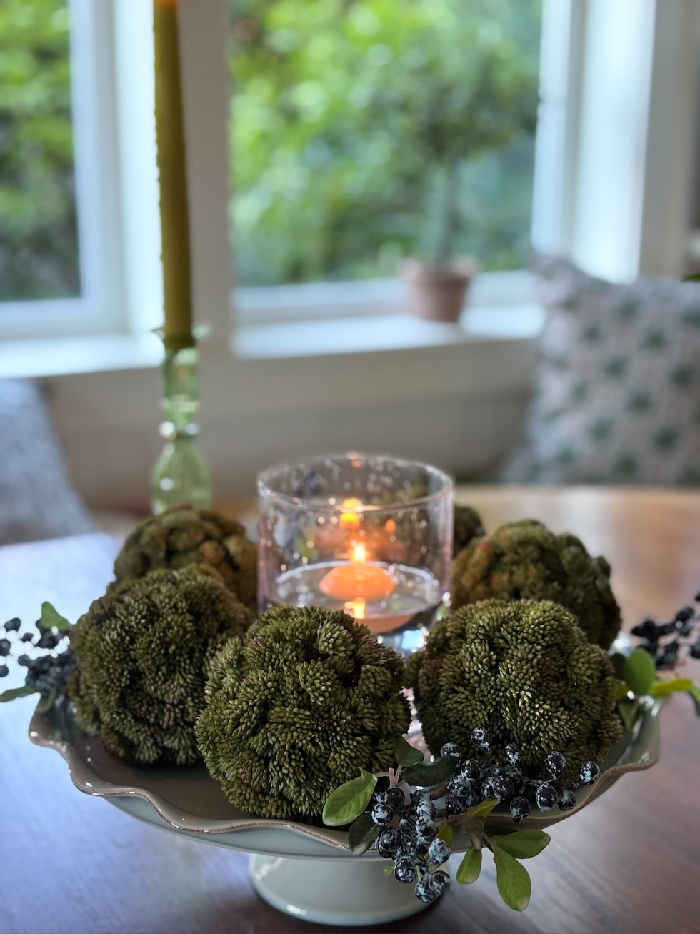 Sources for above: Moss balls // Cake Stand // Block Print Pillow // Inexperienced Throw Blanket