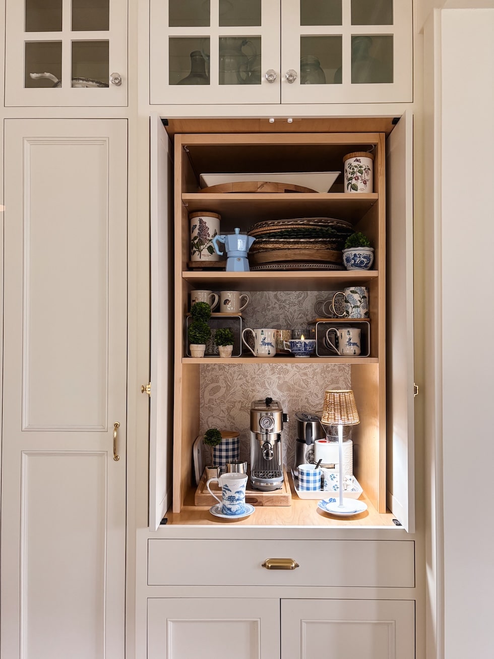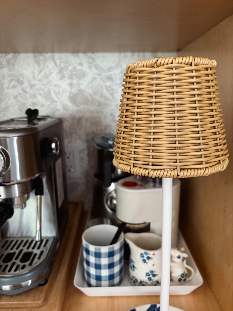 Spring is getting nearer, however the winter mornings are nonetheless so darkish after I go to make my espresso. Final week I had the BEST concept! I purchased on this cordless lamp that I had on the porch and added it to my espresso cupboard. Now I simply faucet the sunshine earlier than making the espresso. This lamp makes my cupboard and winter morning ritual really feel a lot cozier!