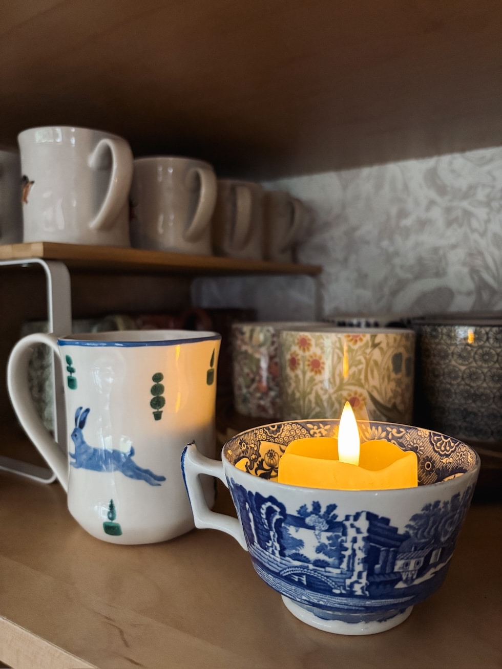One other manner I made my cupboard cozier…these flameless votive candles in a particular teacup. I even set the candle on a timer to be flickering by the point I open up the cupboard to make my morning espresso! Easy joys, associates.