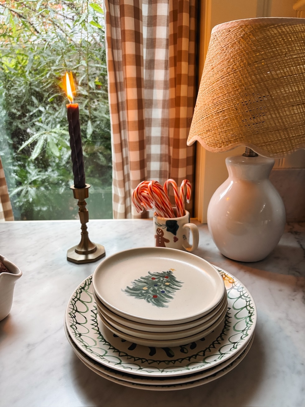 Tree Appetizer Plates // Inexperienced and White Plates Beneath // Gold Candlestick // Lamp