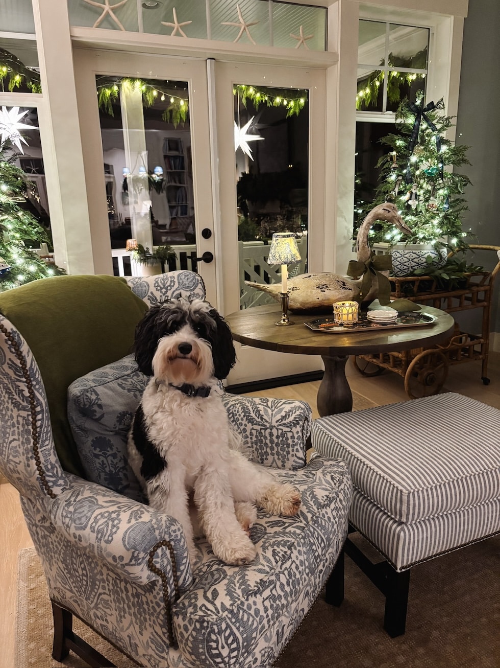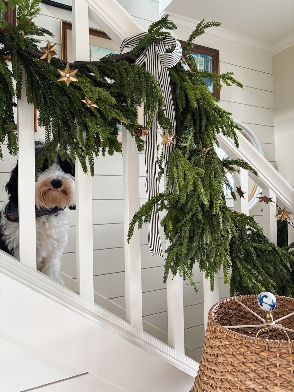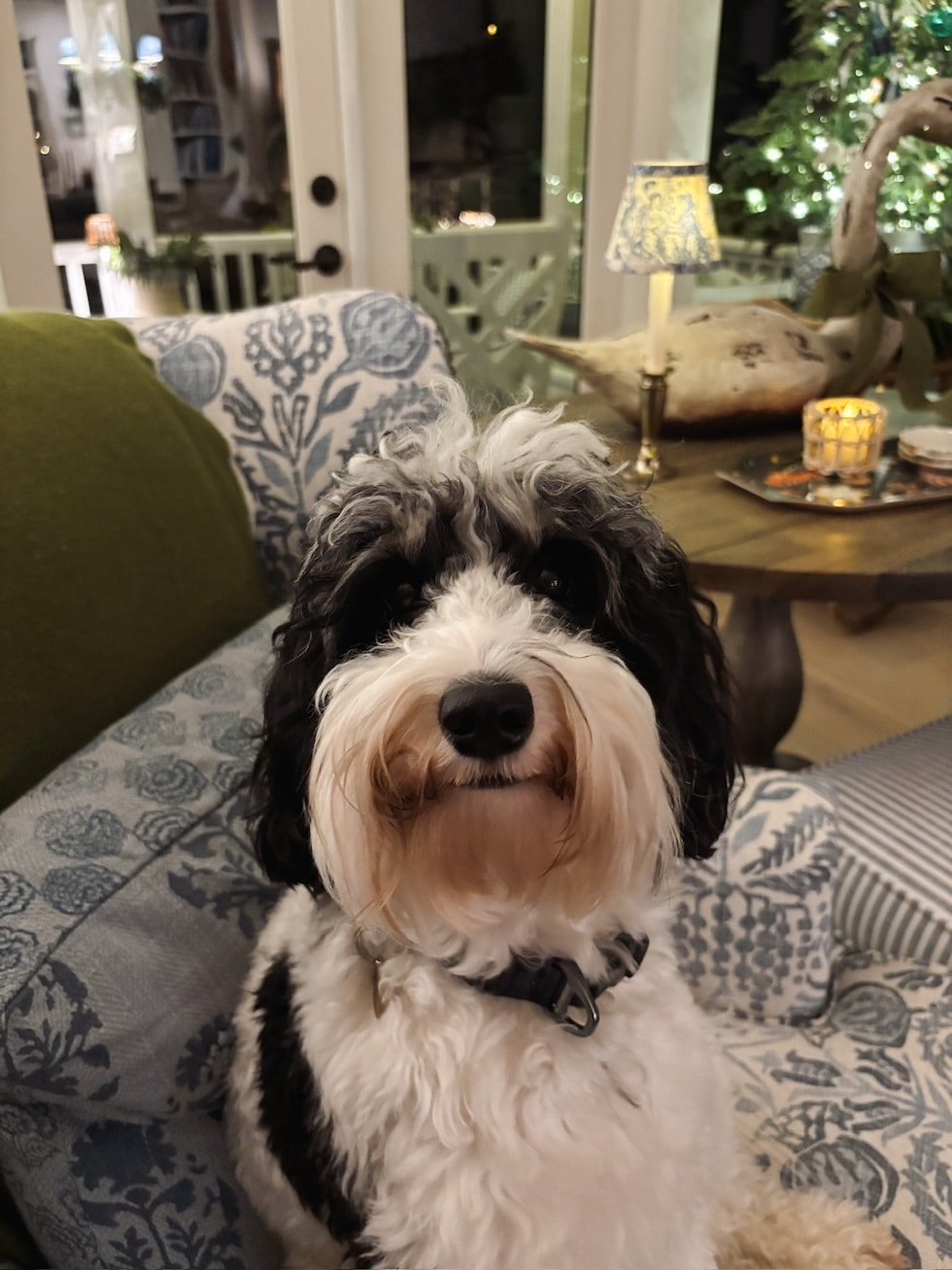 He’s such a candy pup–all the time keeping track of me (even via the garland, simply in case I strive any humorous enterprise and by some means slip out the door with out him). I’ve by no means had such a velcro canine, however I find it irresistible!