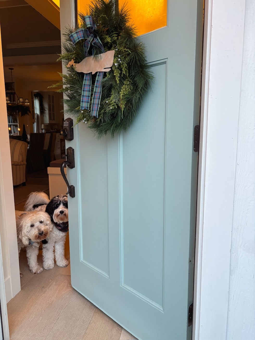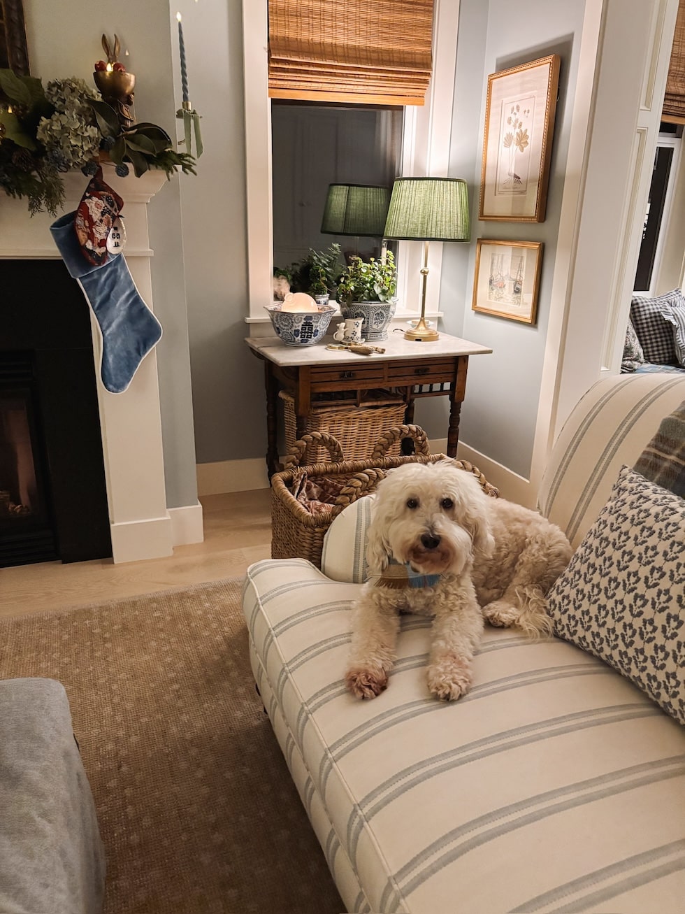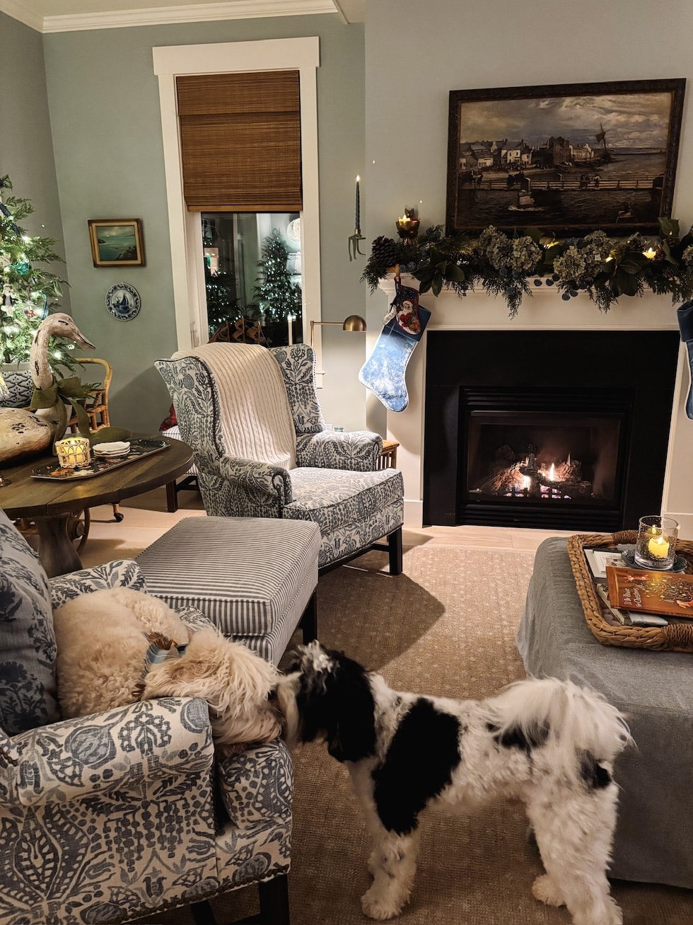 He’s such a candy pup–all the time keeping track of me (even via the garland, simply in case I strive any humorous enterprise and by some means slip out the door with out him). I’ve by no means had such a velcro canine, however I find it irresistible!