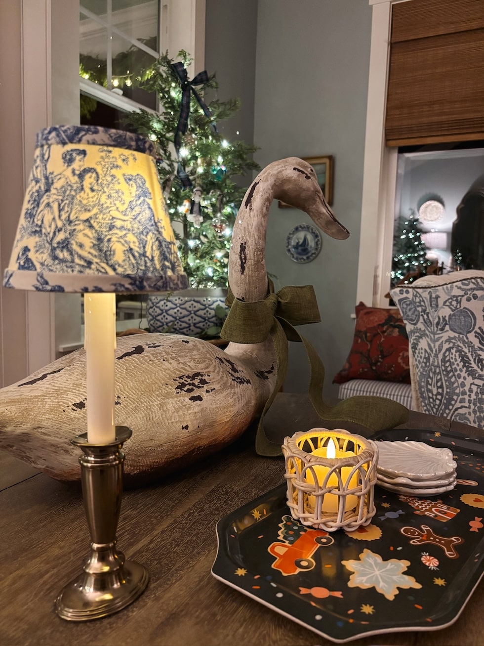 Brass Window Candle // Blue and White Toile Shade // Rattan Tealight Holder // Tray was from right here // Swan is classic