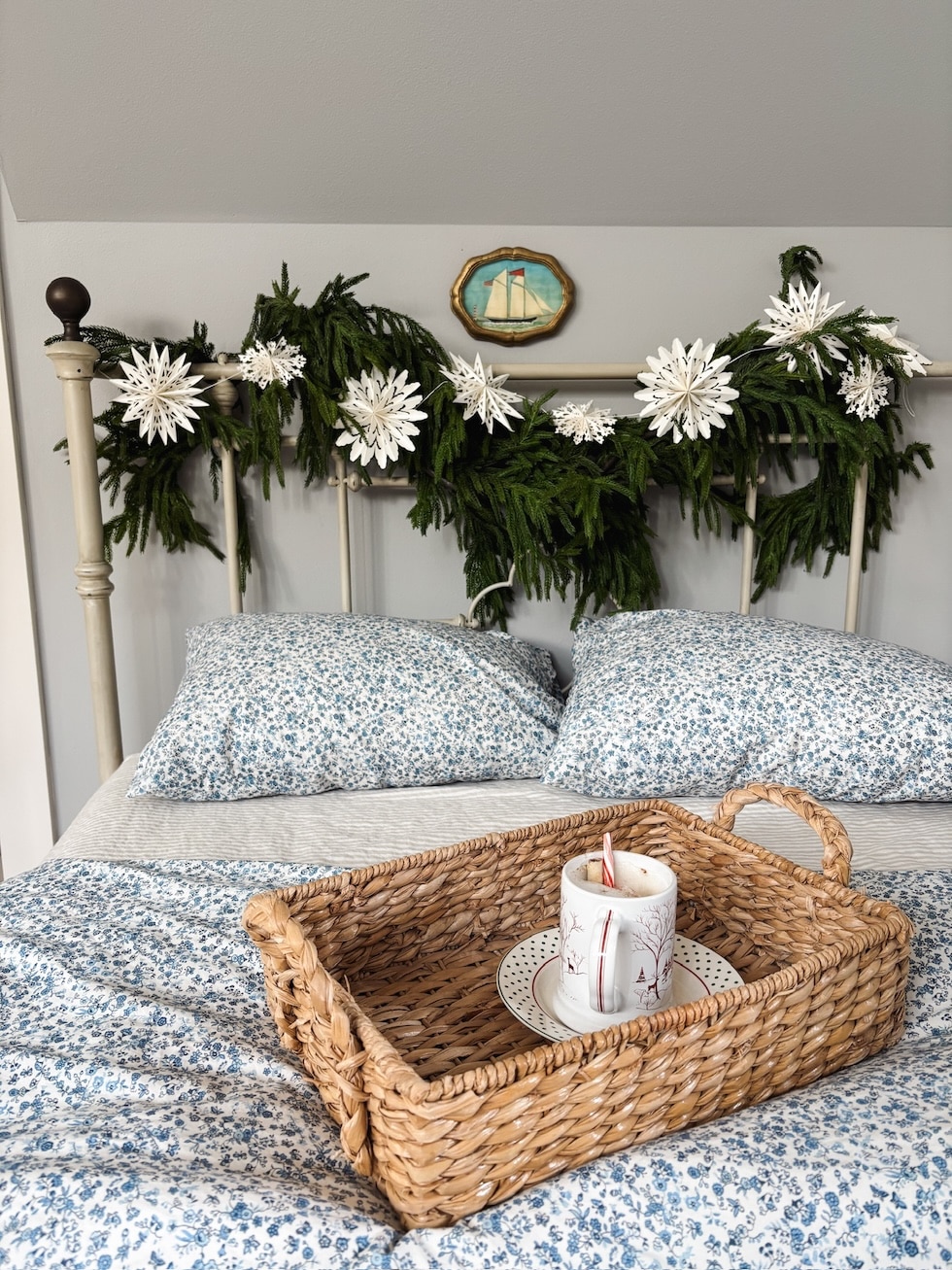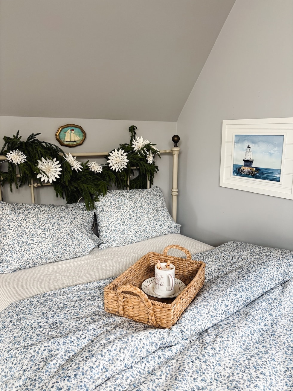 Blue Floral Cover Cowl // Blue Floral Pillowcases // Oatmeal Stripe Sheets // Comparable Garland