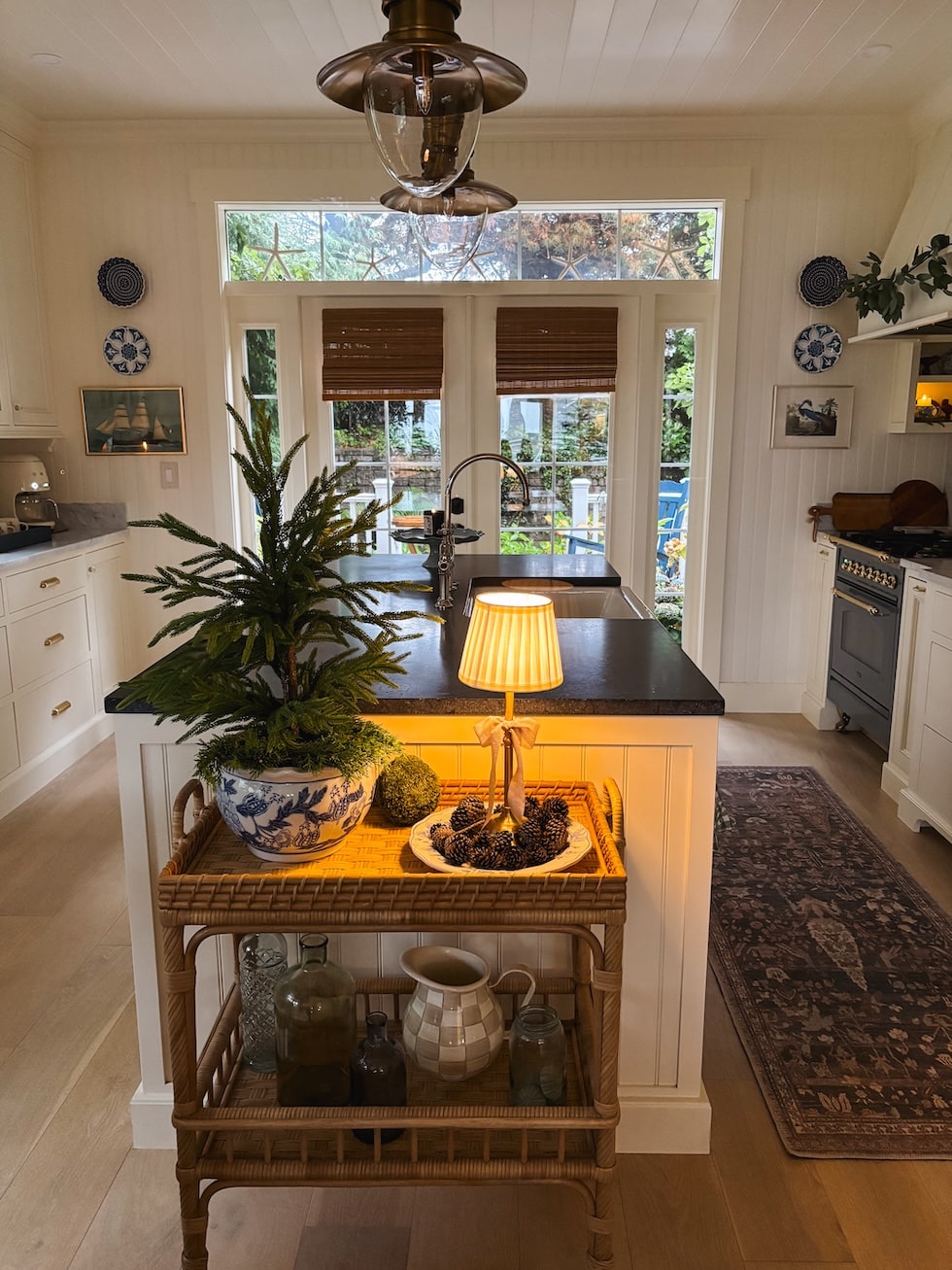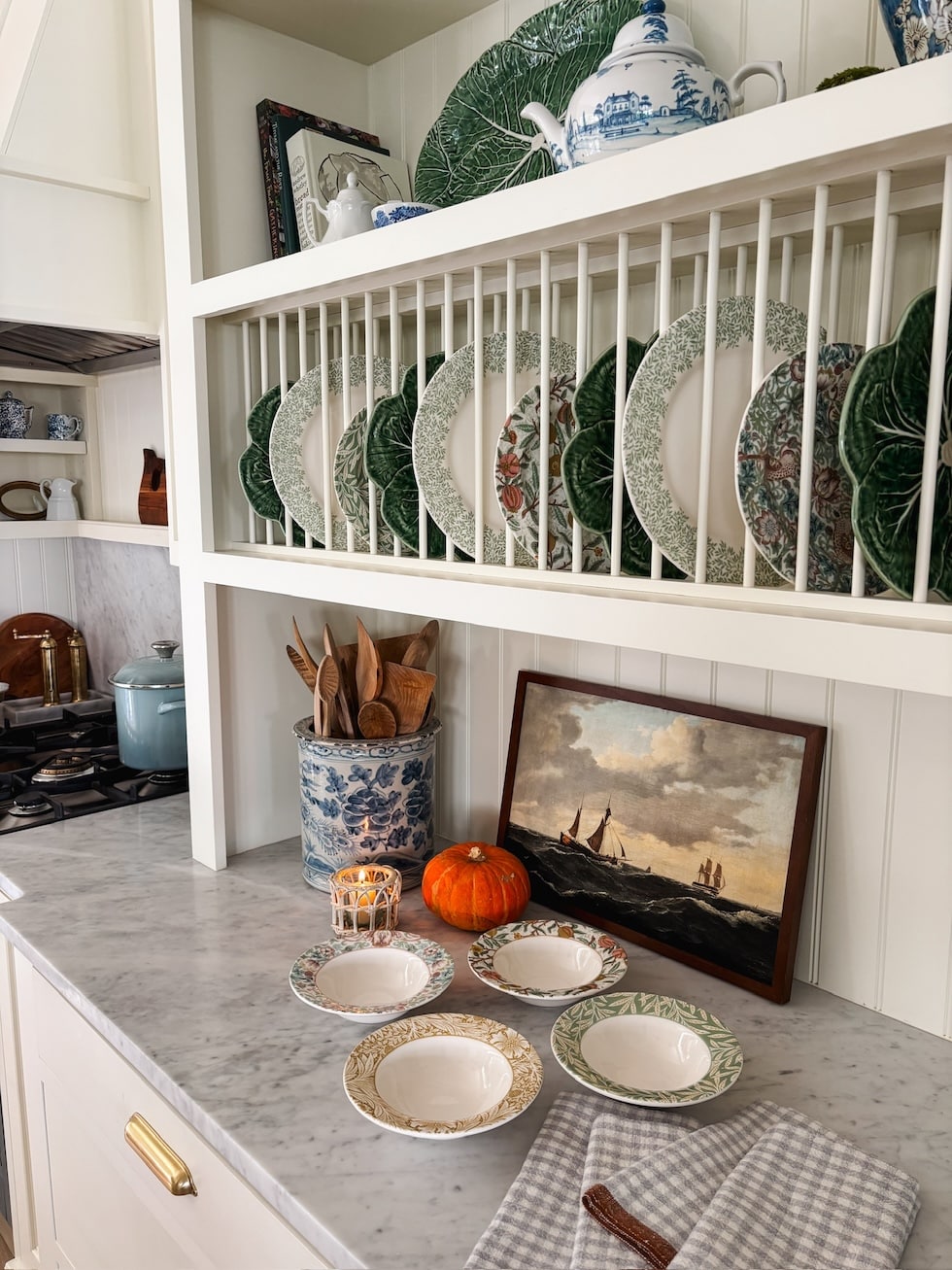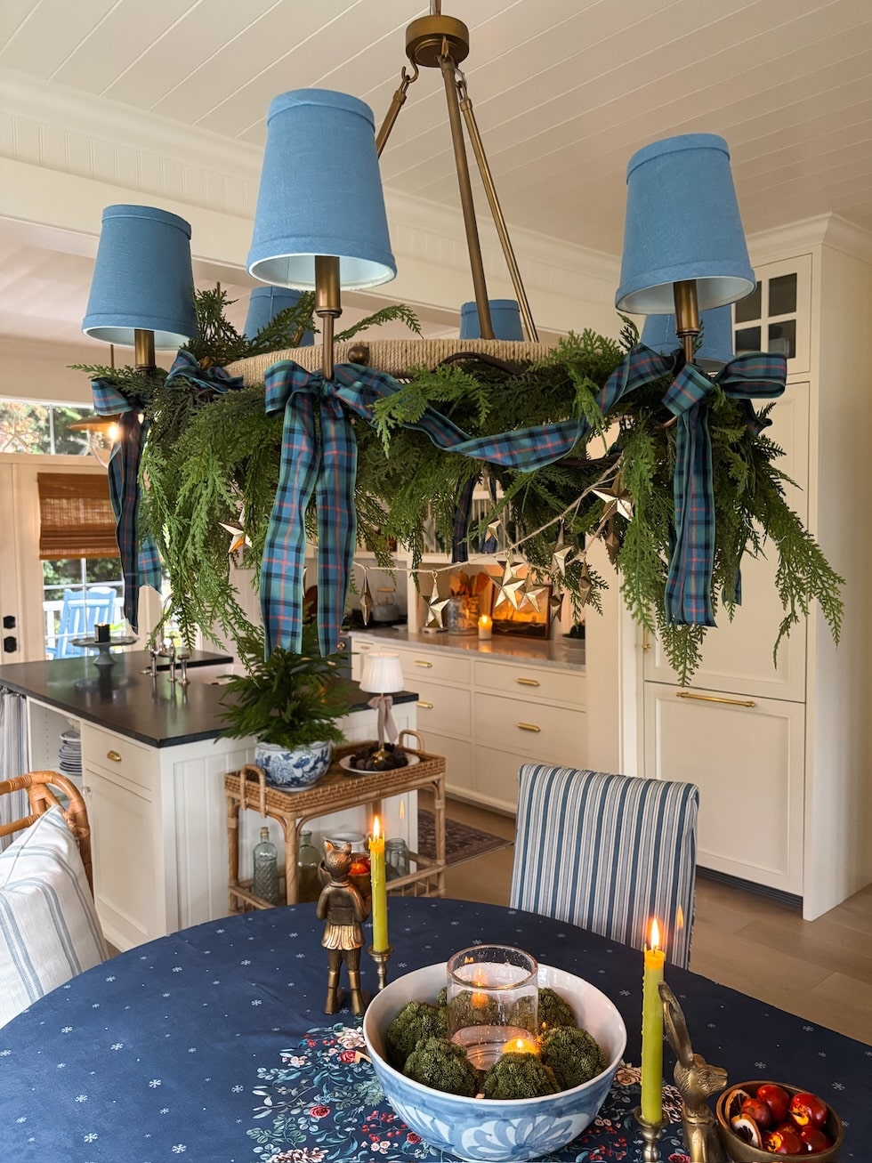 Together with my jute wrapped eating room mild, my navy entry lantern, pleated lampshades, and my blue and white dishes that I’ve used and beloved for years.