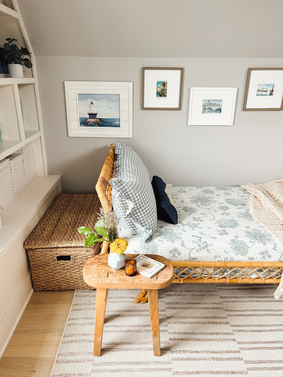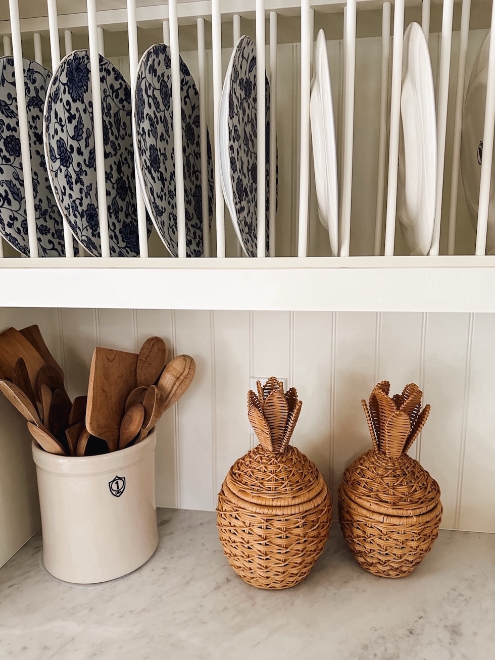 A couple of Serena & Lily faves in our dwelling: my rattan cart (seen beneath, mine is in my kitchen!), small scalloped rattan tray, rattan daybed, wooden dip dyed stools, lidded baskets, wicker pineapple baskets, and extra.