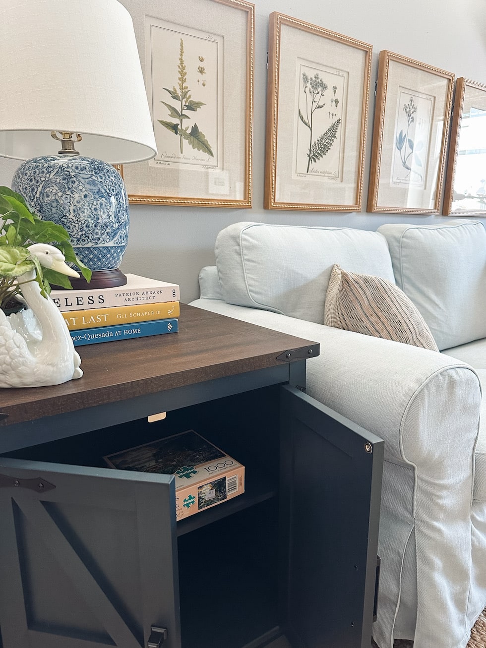 We didn’t have an finish desk for this facet of the sofa so I used to be happy to search out this one. It’s a pleasant deep shade of navy blue and it has loads of floor house and storage.