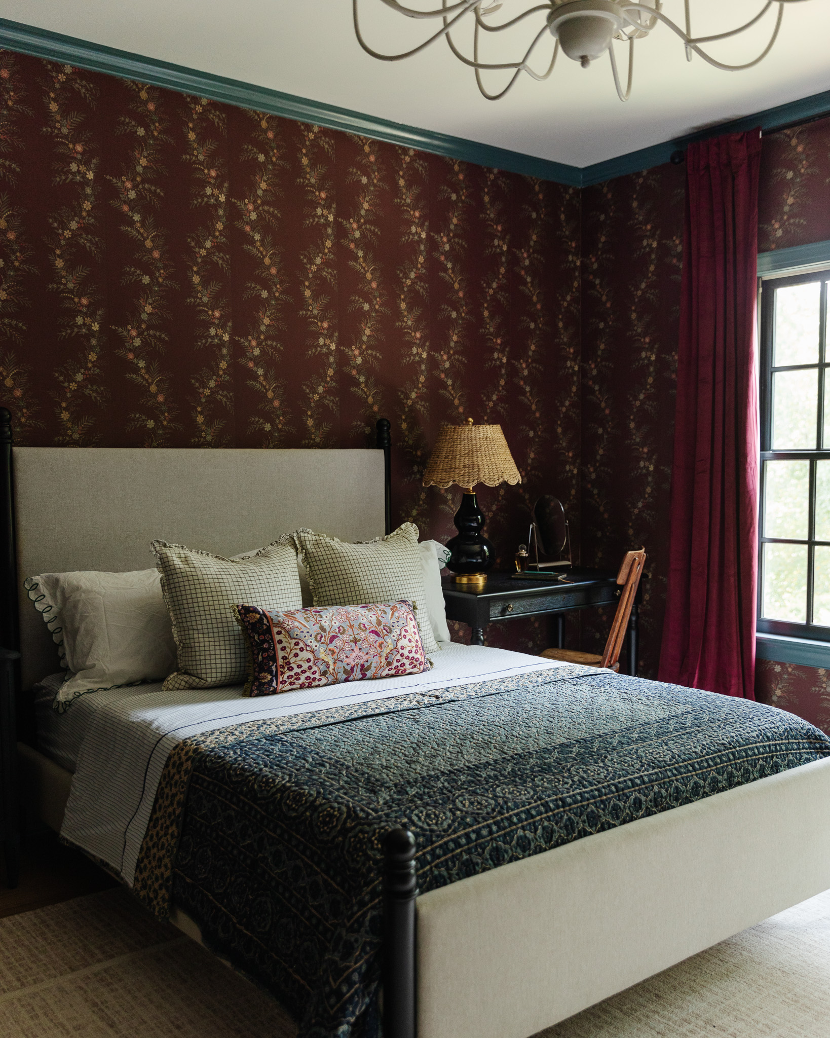 Second, the drapes! They are often actually costly and exquisite (it is numerous material in any case), however they’ll additionally *look* costly and exquisite. These velvet curtains completely match the latter—they add a lot heat to the room with a tone-on-tone impact. I used to be contemplating some golden-hued velvet curtains for the room, but it surely was an excessive amount of “hey, take a look at me I am a curtain!”. Not likely the vibe I used to be going for within the room. However these burgundy drapes actually present the proper light-blocking high quality and comfy really feel with out calling an excessive amount of consideration to themselves. I received the 108″ size so I might cling them excessive to the ceiling and elevate the attention to the room’s top.