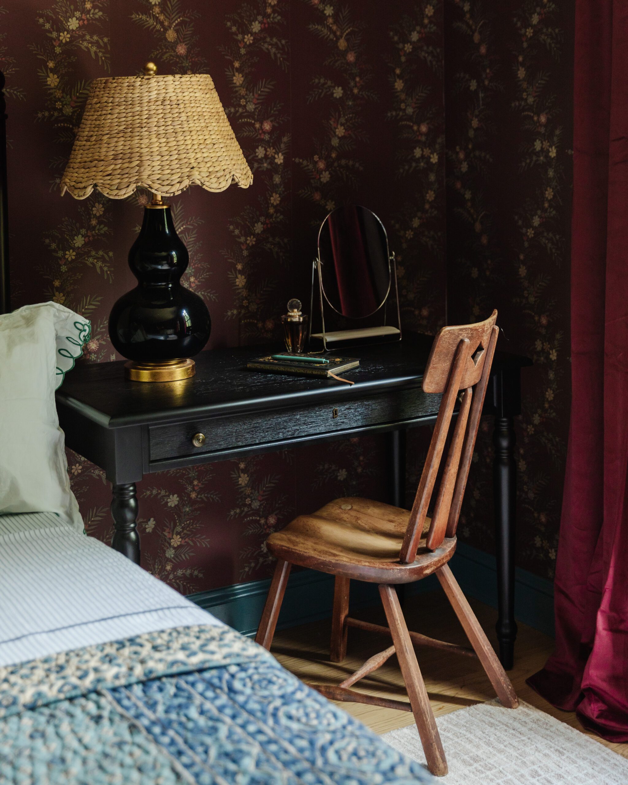 Writing Desk | Chair (classic) | Lamp | Scalloped Lamp Shade | Vainness Mirror | Wallpaper | Velvet Curtains