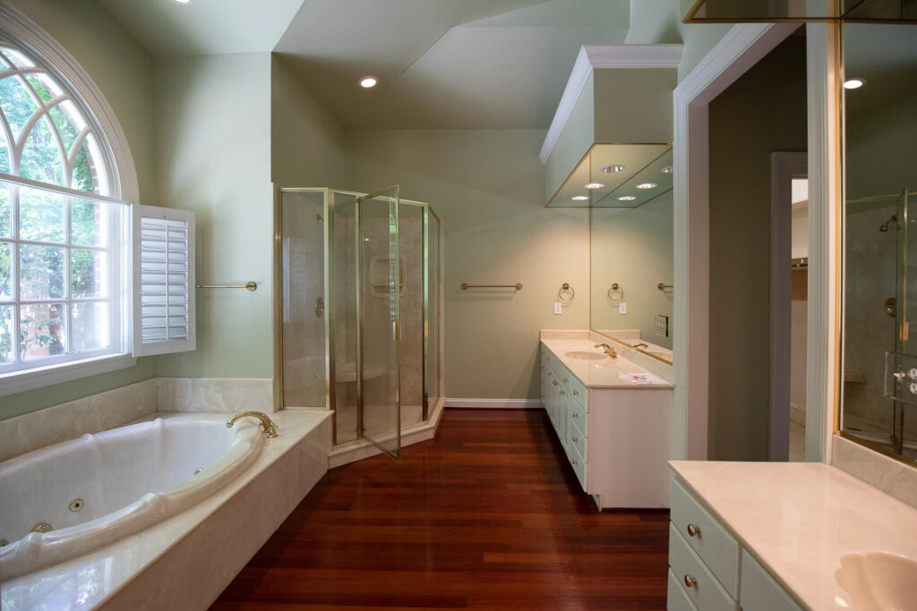 If you happen to flip round from this view, you will note an arch main into the hallway that may home the sit down self-importance and our closets. Extra on these in a minute. You’ll be able to see we moved our bathe right here, mirrored by the water closet on the opposite facet. We beloved having a sink in our final house’s rest room’s water closet, however we opted to make use of that house for a sit down self-importance as an alternative right here. And! Joyful to report we’ve discovered {that a} single glass bathe door actually offers you one of the best of each worlds. No cleansing a complete glass bathe, nevertheless it nonetheless permits mild to stream in. There will likely be a transom window above the bathe door for air motion when we do not have the steam bathe on.