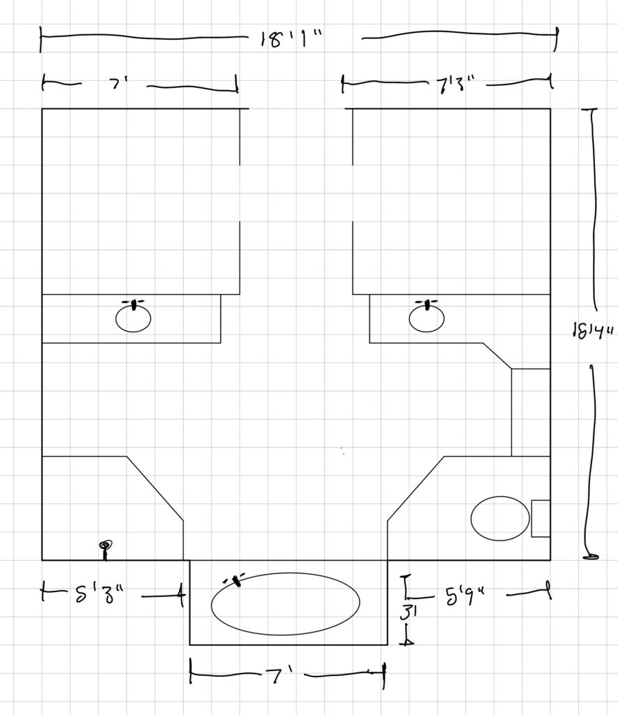 You can too see the his and her closets within the tight hallway that we’re additionally going to be addressing on this renovation as properly, and that may affect our bed room sq. footage. Under is a tough drawn ground plan of our present rest room format. The squares on the high of the drawing are our closets.