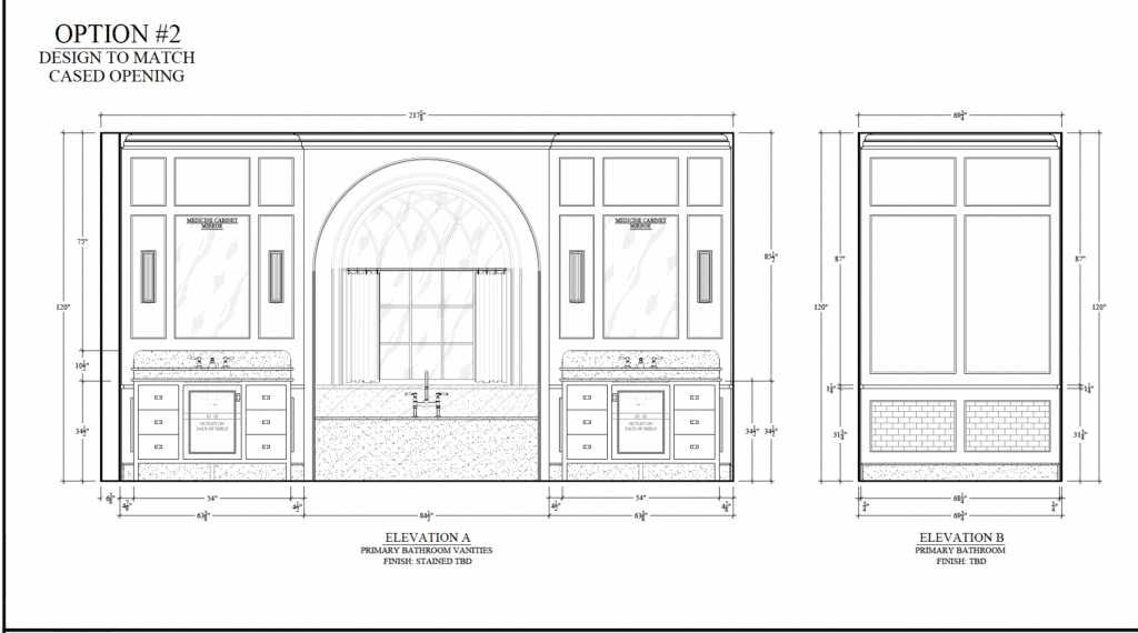 This primary elevation is wanting into the toilet on the arch window. You’ll be able to see we moved our vanities to this wall! I can’t wait to not be backlit your entire time I am preparing!!! Every of our mirrors will likely be medication cupboards for extra storage. We saved the bathtub in its present place, and are even leaning towards doing an undermount tub, surrounded by stone slabs. You may get a a lot bigger tub in case you do undermount which is interesting to us, as is the veiny stone slab I am envisioning. (However, I do LOOOVVVEE a free-standing tub, too, and I’ve actually been forwards and backwards one million occasions on that call.) The bathtub nook can have a cased opening within the renovation. Choice 1 (above) has a wider opening that also permits for the paneling on the partitions to proceed.