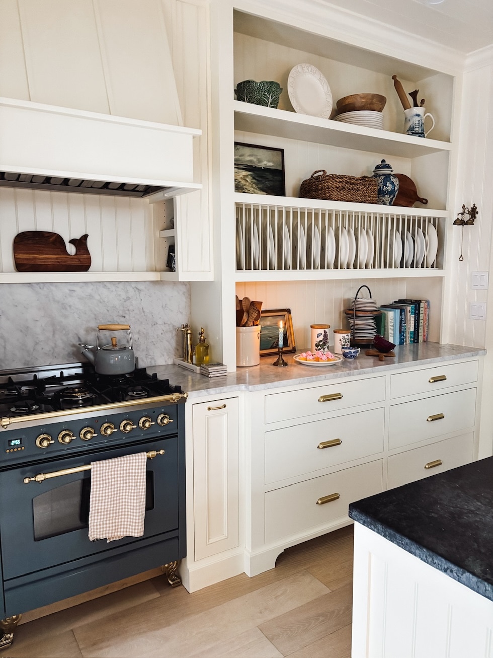 We additionally added a backsplash in marble by a lot of the counters and behind the range — I really like the way it basic it appears to be like (which is the look we had been going for, just like the kitchen has been right here for years!). I’m so glad we added that element on the final minute. The additional marble feels good within the room and appears cleaner than simply caulking across the beadboard.