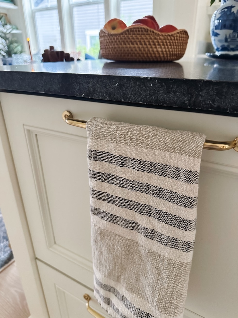 Blue and White Toile Cafe Curtain (I alter this seasonally), it’s at present this one: Striped Cafe Curtain