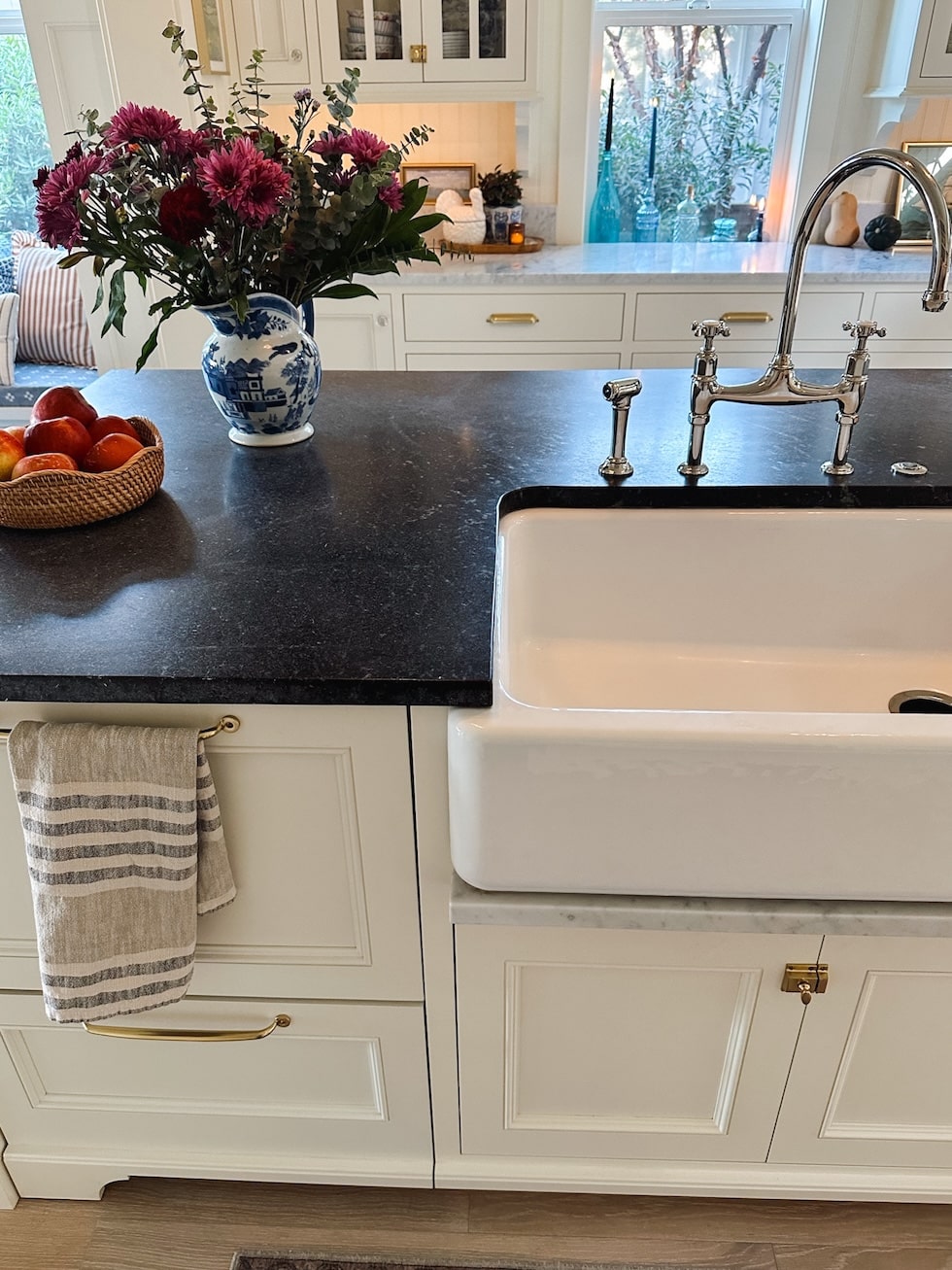 We had our counter folks add a marble drip ledge below our farmhouse sink to assist shield the cupboards beneath from water (my husband insisted on having a sprayer within the sink however he doesn’t maintain the water IN the sink so this ledge was a security function because it slows down the water drips, ha. It really works!).