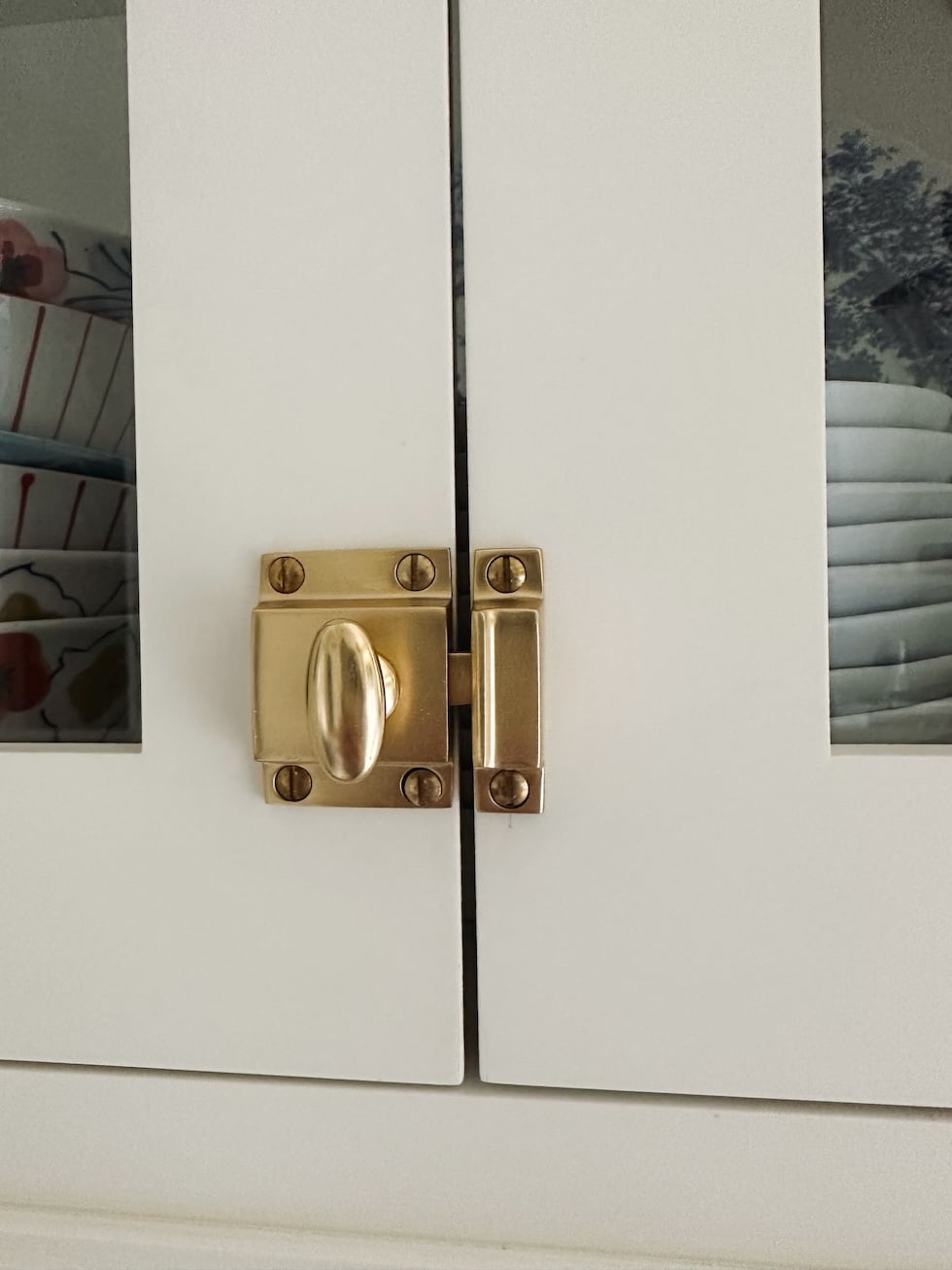 Oval Cabinet Latch (on glass cupboards, below sink, on espresso station cupboards) in Aged Brass