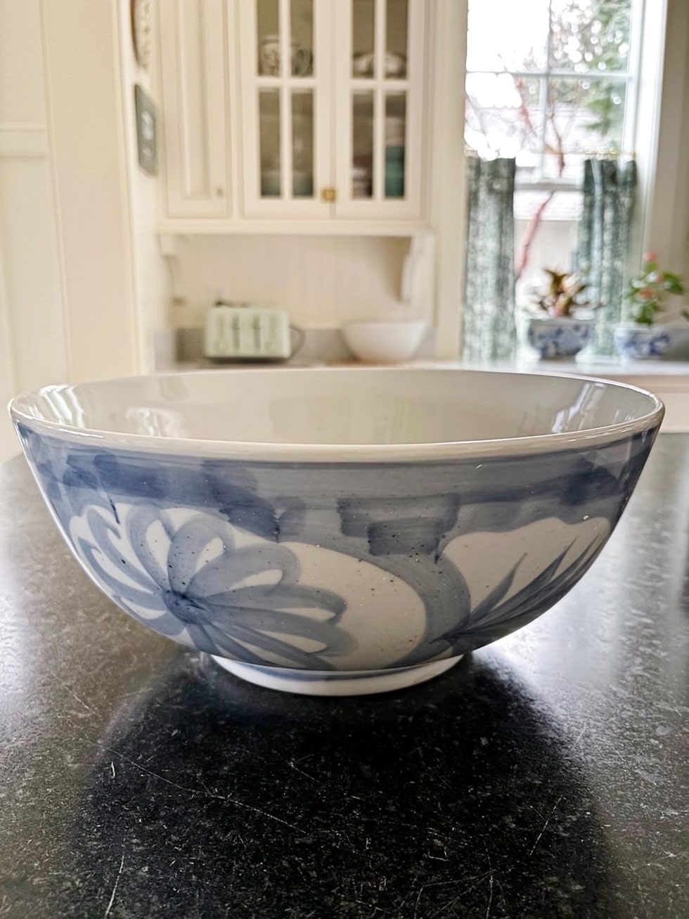My blue and white bowl (above) has been out of inventory for awhile however is again. I’ve seen related and even the identical one for a whole bunch of {dollars}. It’s giant and really heavy, I feel it seems to be and feels extra excessive finish than the value may recommend!