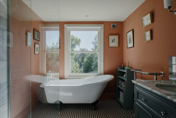 Under it is a beautiful heat shade of terracotta that’s nice for a loo the place there may be usually a variety of shiny white. The ceiling talks to the black and white flooring so no want to do this orange in addition to which may really feel considerably claustrophobic. However the window actually stands out. If it matched the wall it could instantly draw to the attention to the view past whereas, in white, you’re instantly aware that there’s something between you and the view. In white the window acts as a barrier and breaks up the movement.