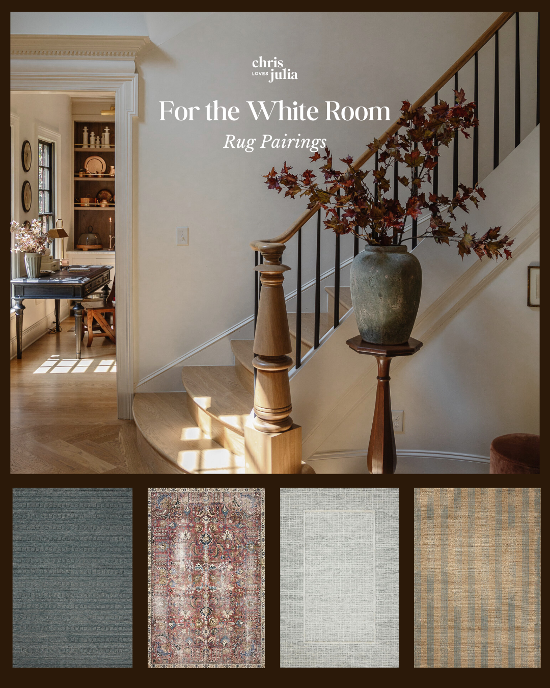 In an all-white house, the sky is admittedly the restrict for rug types! So as to add colour, I normally decide a rug with some blue in it, which feels subtle and elevates any house. If it is a well-trafficked room, a darker tone or a extra weathered look on a rug will assist disguise put on over time. However in a extra formal sitting house, a lighter rug helps the room really feel extra open and ethereal.