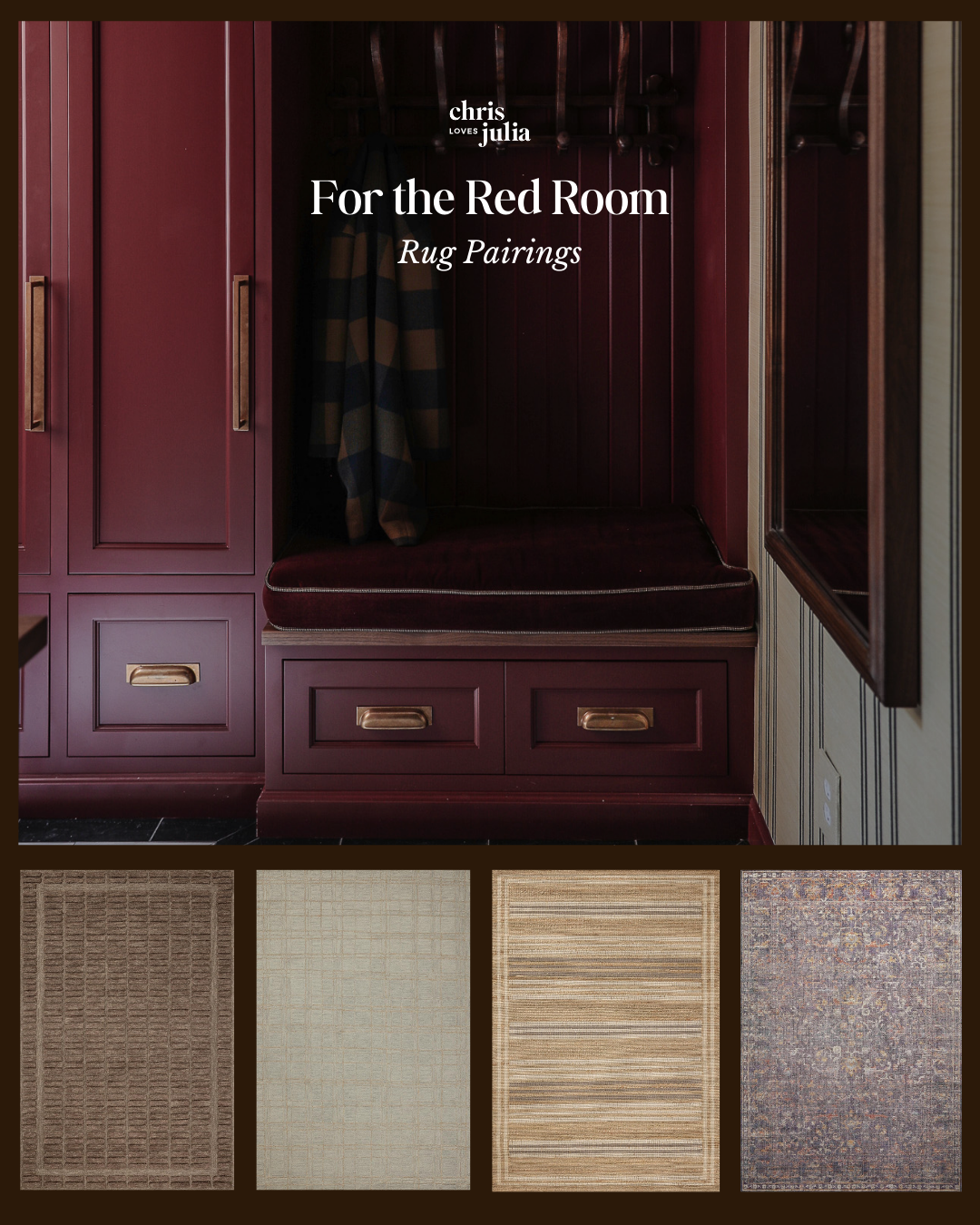 Ah, pink—she’s the star of any present. Burgundy is such an attractive selection for a wall colour, and I like how a darkish rug can emphasize the room’s enveloping, cozy high quality. Since pink is daring, I might maintain rug patterns extra delicate in a pink room. A subdued grid, stripe, or conventional sample lets the partitions shine, but provides that plush consolation underfoot that makes you by no means need to depart.
