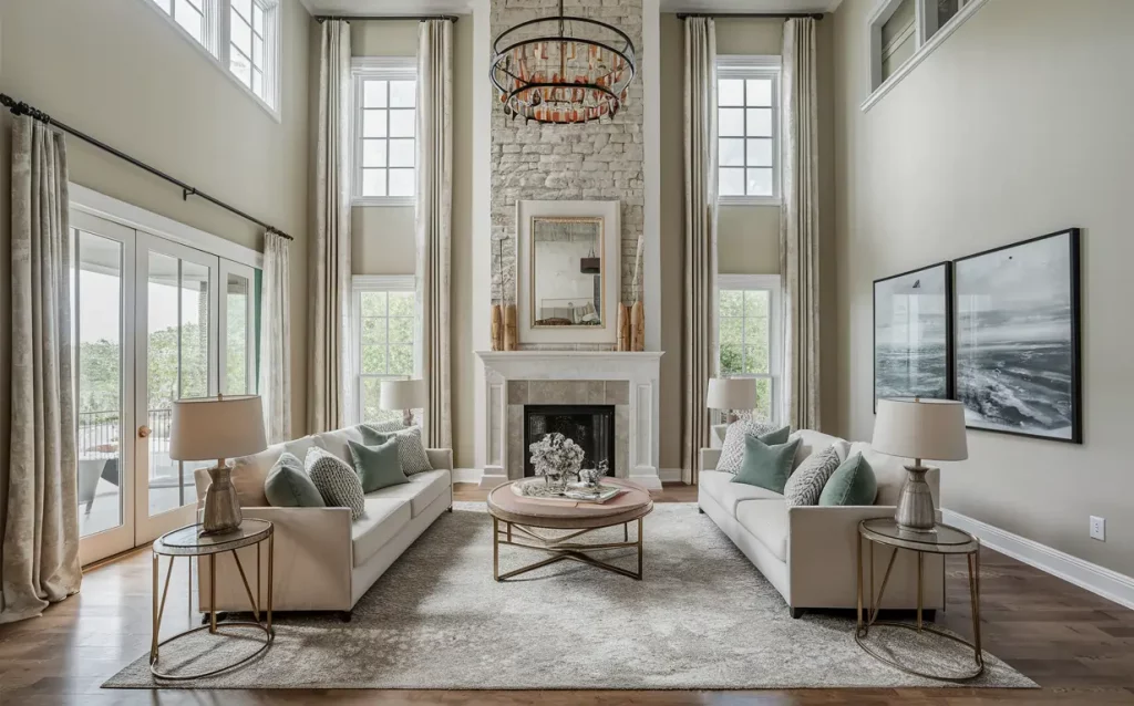 ✅ As an alternative of hanging one giant piece of artwork within the excessive ceiling room and making it one other towering function, deliver a customized piece of artwork and divide it into 4 panels