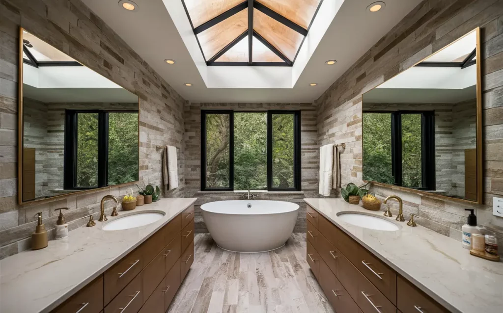 Fancy a darkish wooden ceiling? Go forward, and do it. They’re sculptural and a murals. Set up wooden with waves or loads of motion in it should you’re designing them for a contemporary lavatory. Your consumer’s finances doesn’t enable for an entire picket ceiling, right here’s a budget-friendly choice: catchy wooden tiles create a visible feast, simply as a lot as actual wooden does.