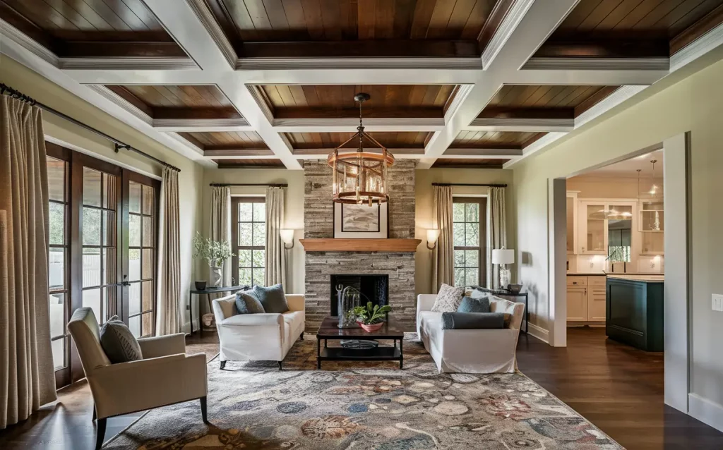 | Trendy coffered ceiling | Characterised by clear strains, and a minimalistic aesthetic. You possibly can create this look with varied supplies – wooden, metallic, and concrete. Geometric coffered ceilings are apt for contemporary design types. |