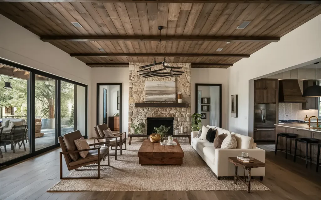 Weathered picket ceilings with beams deliver texture and creativity to country-style kitchens and residing rooms. When mixed with stone partitions they’re perfect to exude a uncooked and rustic environment.