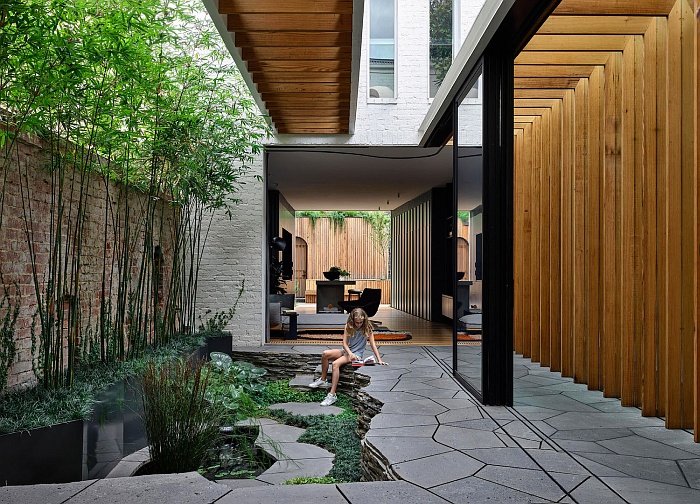 Including to the house’s sense of discovery, a glass-floored bridge carries residents between the 2 principal buildings. Via the timber trusses beneath their ft, glimpses of the landscaped courtyard seem — a serene house formed with the assistance of Robyn Barlow Design, whose panorama strategy enhances the house’s architectural rhythm with understated grace and a touch of Zen. To at least one facet, a hall framed by sliding glass doorways and heat timber beams reinforces the house’s devotion to out of doors connection and simple residing.