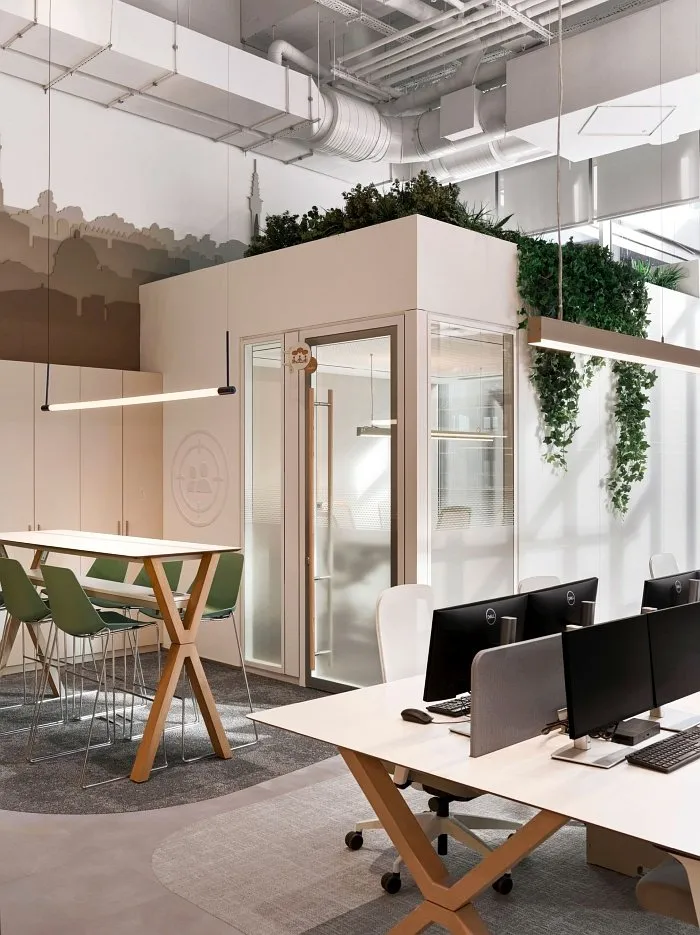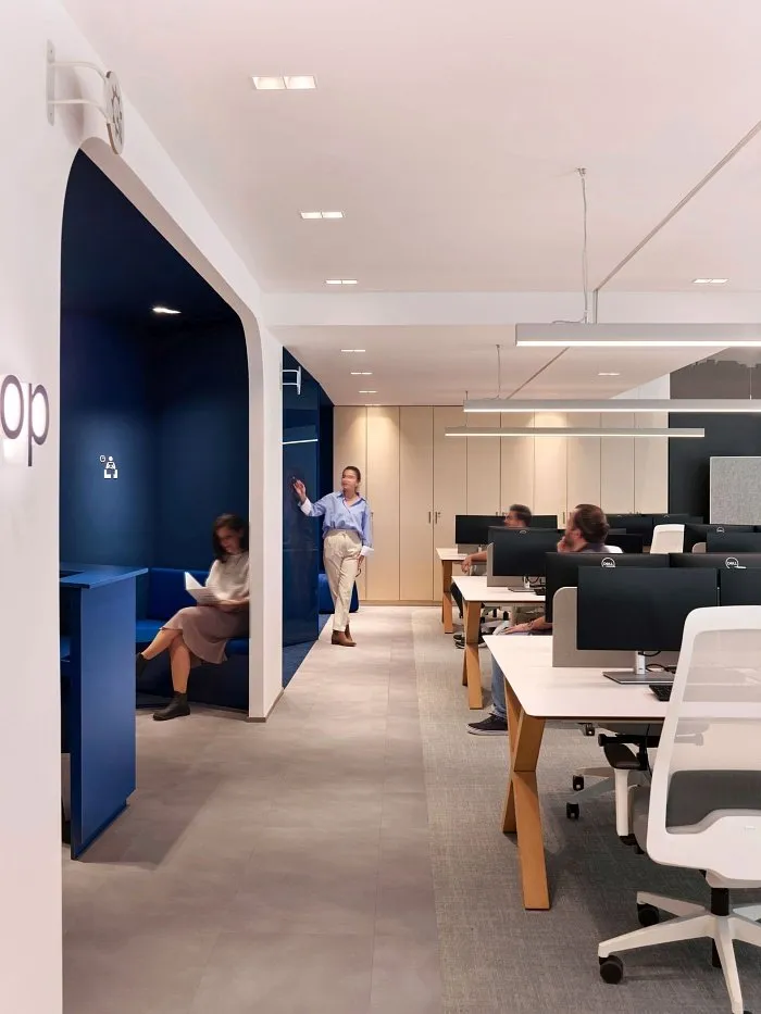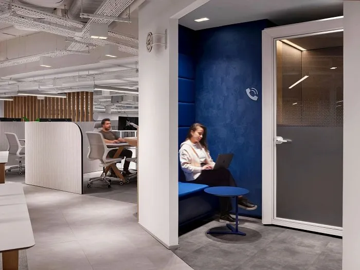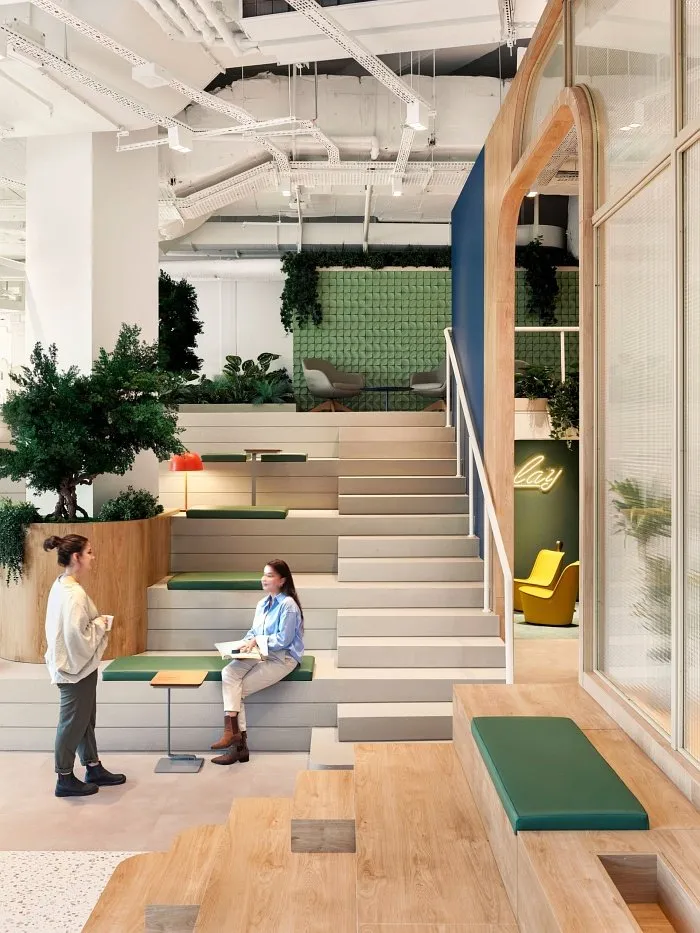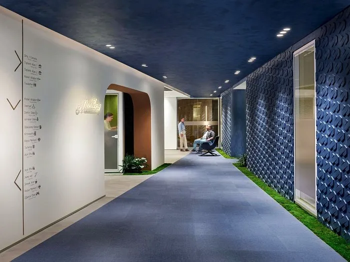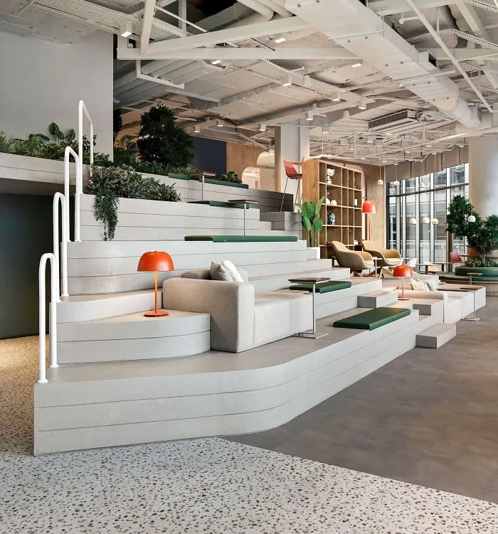 Workstations are animated by sudden interventions, together with tram-inspired varieties that introduce rhythm and motion whereas doubling as focus desks and semi-open assembly spots. Open collaboration areas, scorching desks, and casual assembly factors are distributed all through the floorplate, supported by assorted acoustic options that permit each interplay and focus. A central breakout space acts because the social coronary heart of the workplace—half lounge, half agile workspace, and half connector to the mezzanine. Designed like an indoor terrace, it invitations staff to pause, collaborate, or just get pleasure from a change of perspective.