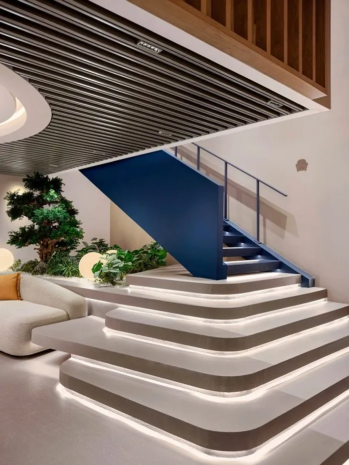 A defining gesture seems instantly after entry, the place a blue circulation line cuts by means of the plan just like the Bosphorus. This flowing axis leads right into a dramatic double-height gallery house with a mezzanine above, earlier than unfolding right into a sculptural staircase whose curves echo town’s iconic waterways. Customer motion is rigorously choreographed to protect focus inside the work areas. Assembly rooms are positioned near the doorway, providing privateness for workers whereas nonetheless offering a welcoming expertise for company. Above, a shopper lounge on the mezzanine enjoys visible connection to the workplace beneath with out disrupting day by day workflows.