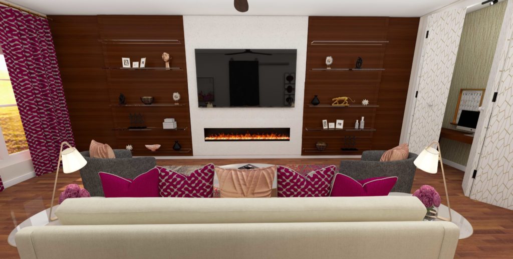 Foyr Neo got here to the rescue proper from the outset. Its intuitive design platform allowed me to draft layouts that would incorporate each an workplace and a lounge throughout the present dimensions. By means of numerous design iterations, I settled on a format that featured a sliding barn door to cleverly conceal the workplace house when not in use.