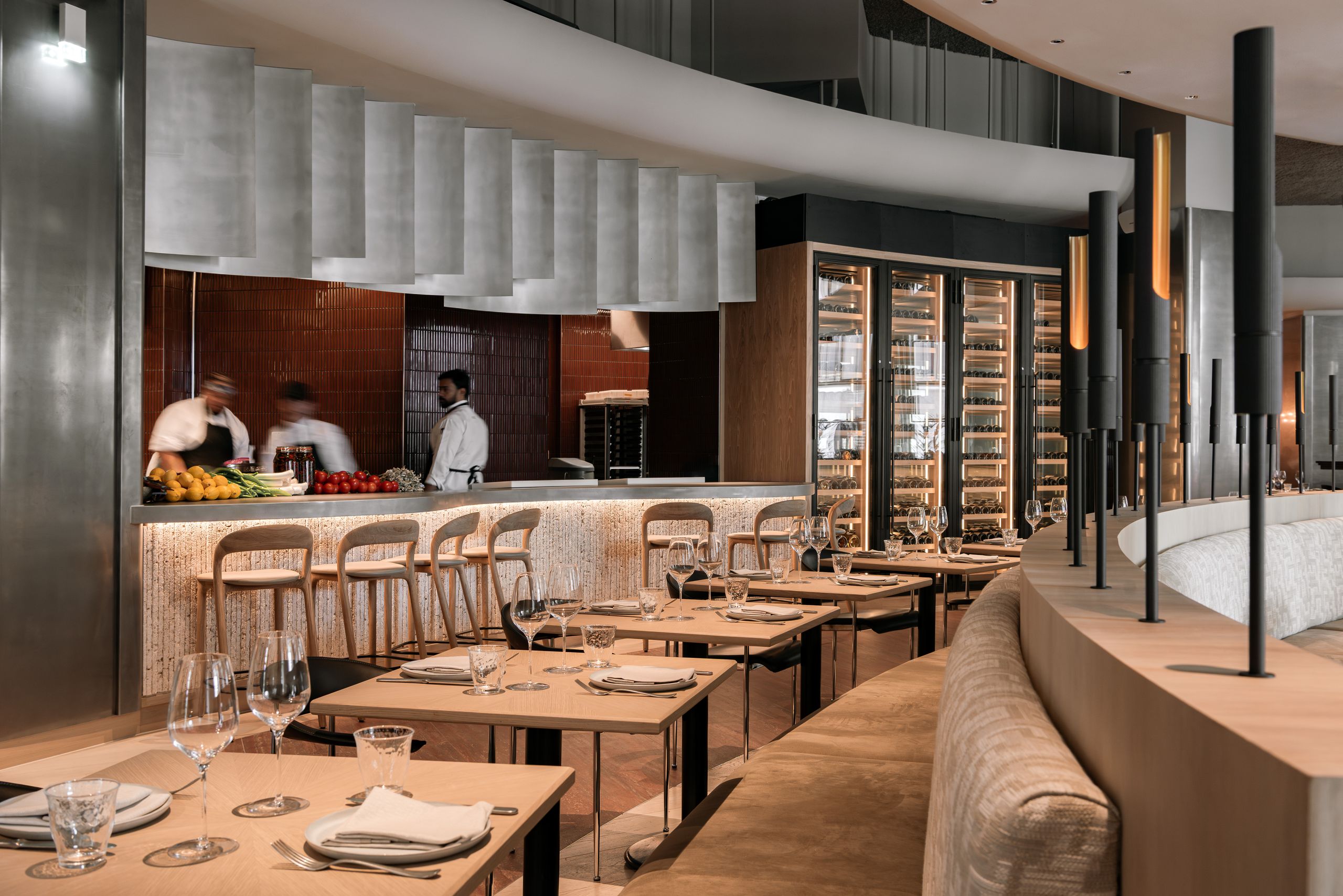 Suspended aluminium fins choreograph the view in the direction of the kitchen’s fiery procession, reworking cooks into performers. All through, the artwork assortment options works by Richard Serra, Sterling Ruby, Meg Cranston, Joyce Pensato and Alighiero Boetti. For these looking for a contact of hush with out disrupting the environment, the semi-private eating room glows like an ember-lit enclave, illuminated by customized PS Lab’s sculptural lighting.