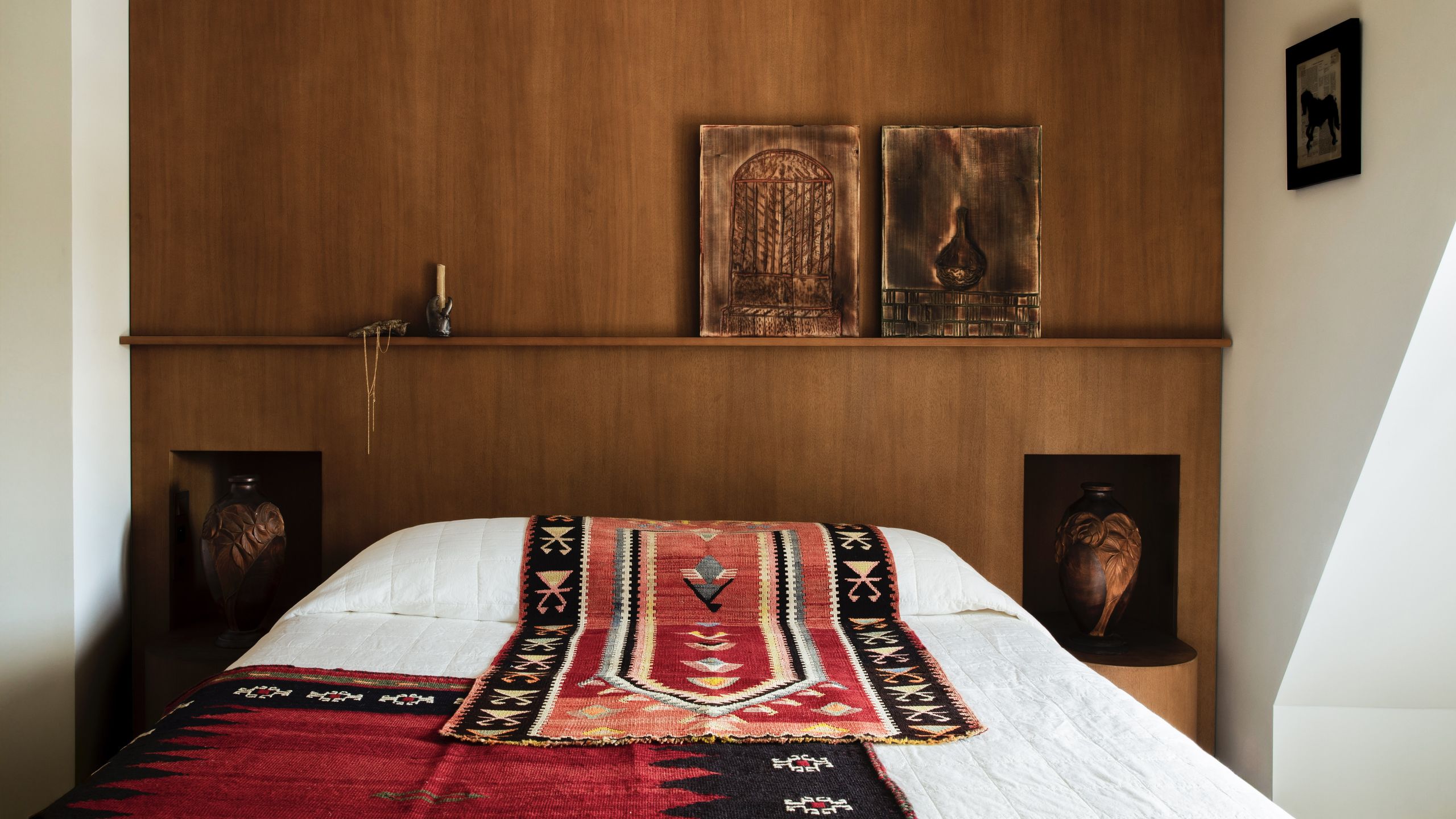 Bedside lamps: Katja Pargger; on desk: bronze toad candlestick by Eloise van der Heyden; pouf: Studio Ebur