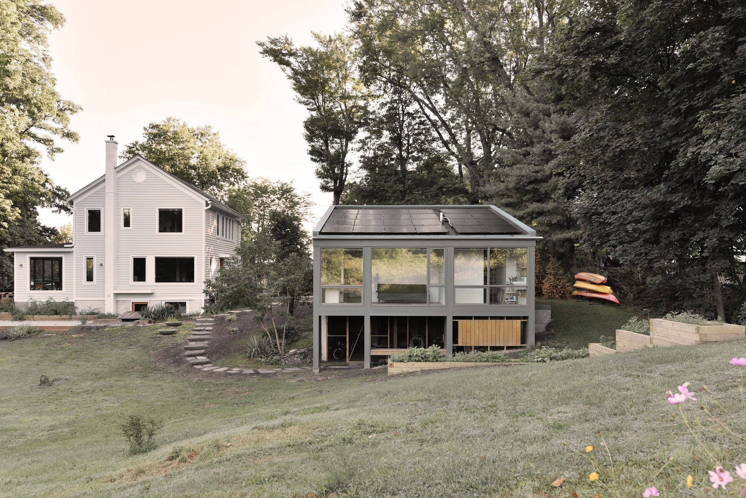 The mono-pitch roof is roofed with photo voltaic panels that reap the benefits of the south-facing orientation, with high-level home windows on the north-facing entrance façade bringing in one of the best working mild. A wall of glazing overlooks the backyard and the panorama past to the south, with the Hudson River within the distance past.